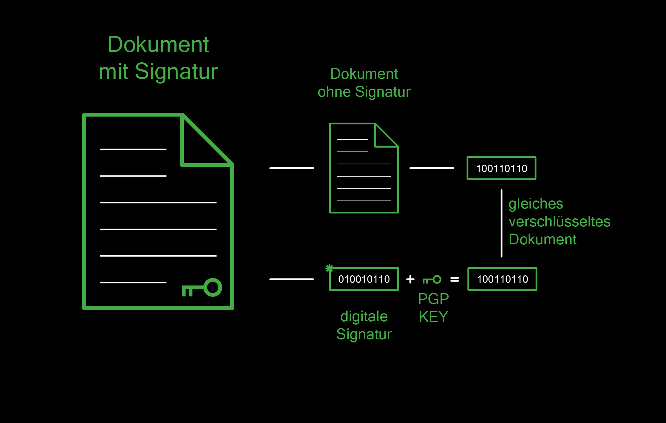 Hat man den Schlüssel des Absenders, so kann man die Nachricht überprüfen und so sehen, ob die Nachricht tatsächlich von der Person mit dem Schlüssel erstellt wurde. Stimmt das verschlüsselte Dokument nicht mit dem signierten Dokument überein, so wurde es mit einem anderen PGP KEY verschlüsselt und ist nicht von Cicada.